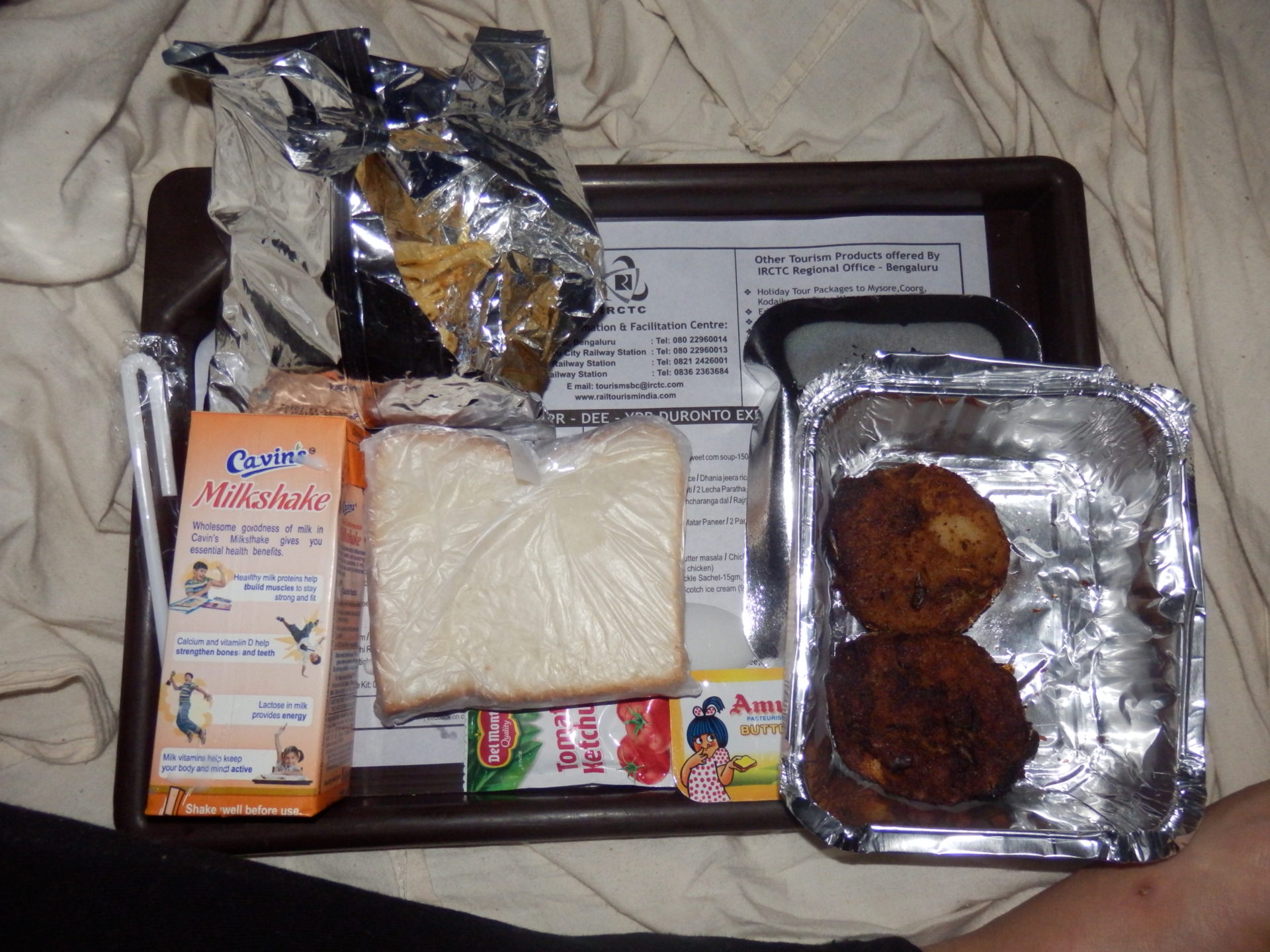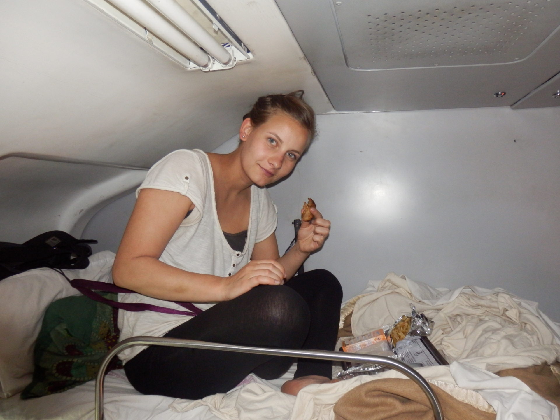 Diese Zugfahrt bedeutet für mich, im Vergleich zu vorherigen, Entspannung und Luxus: Wir haben die Klasse „3 A/C“ gebucht, das bedeutet klimatisiert, ein Bett in einem Achter-Abteil mit Bettlaken, Decke und Kissen und Komplettverpflegung inklusive Wasser, Chai und Non-Veg. Zwischen den Wagongs gibt es überaschenderweise Mülleimer und auf der verhältnismäßig sauberen Toilette gibt es unerwartet Seife!! Dafür haben wir auch einen deutlich höheren Betrag bezahlt: 3500 Rupien, mehr als 40 Euro. Für die unklimatiserte Variante, genannt Sleeper Class,(die in diesem schnellen Zug gar nicht angeboten wird) bezahlten wir sonst immer um die 10 Euro. Somit ist Zugfahren wirklich die günstigste Variante, um in Indien quer durch das Land zureisen!