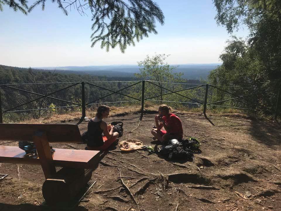 Obwohl wir uns erst um 17 Uhr am Donnerstag im Harz trafen, war schon dieser Abend ein richtiger Hit. Frank übertraf sich selbst mit seiner Navigation kreuz und quer durch den Harz. Ab und zu wurde gestempelt und dazwischen genoss ich die herrliche und abwechslungsreiche Landschaft des Harzes. Immer wieder gab es kürzere  An- oder Abstiege, die es in sich hatten, dazwischen auch flachere Abschnitte. Nach 30 km fast ausschließlich Trails gelangten wir am späten Abend zu unserer Luxus Unterkunft: eine Schutzhütte mitten im Wald mit herrlicher Aussicht, Balkon und Picknickecke.